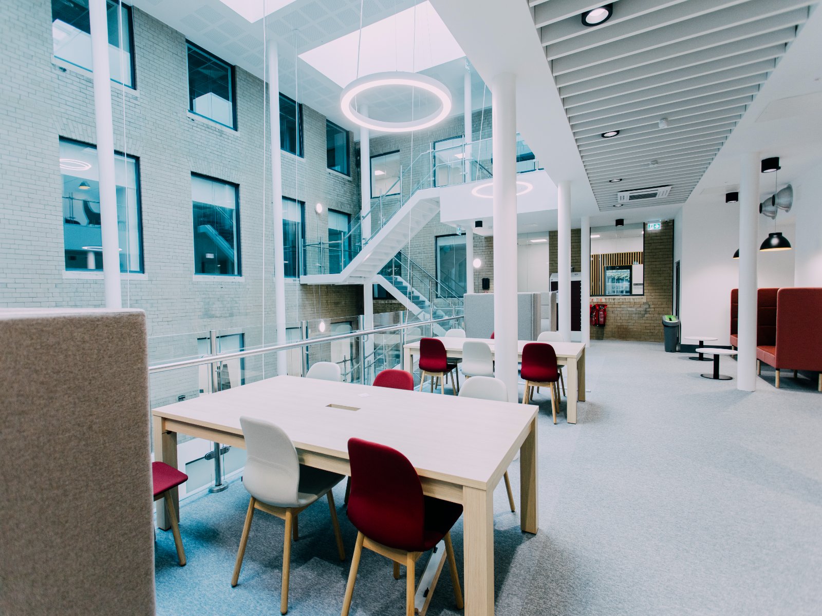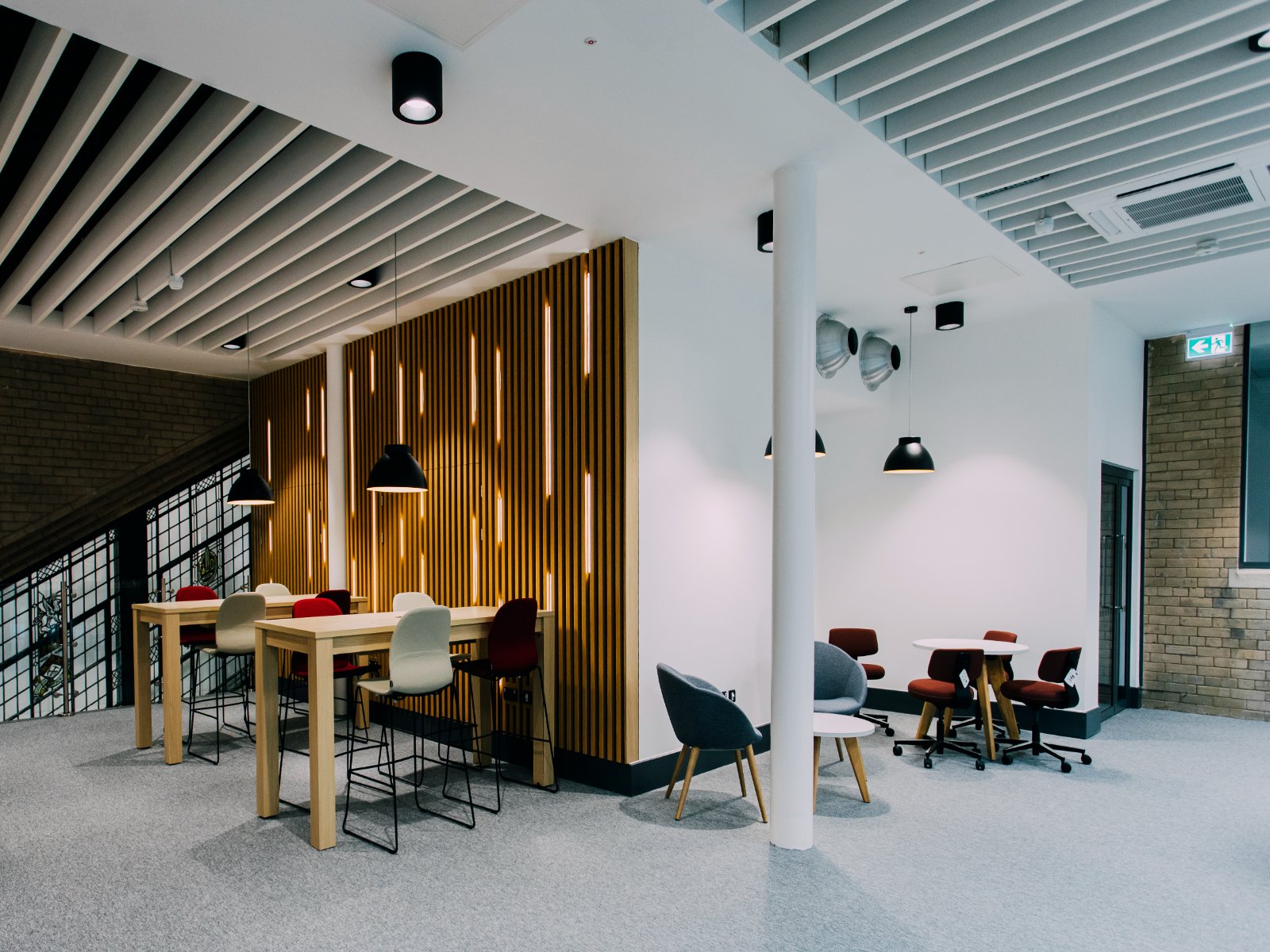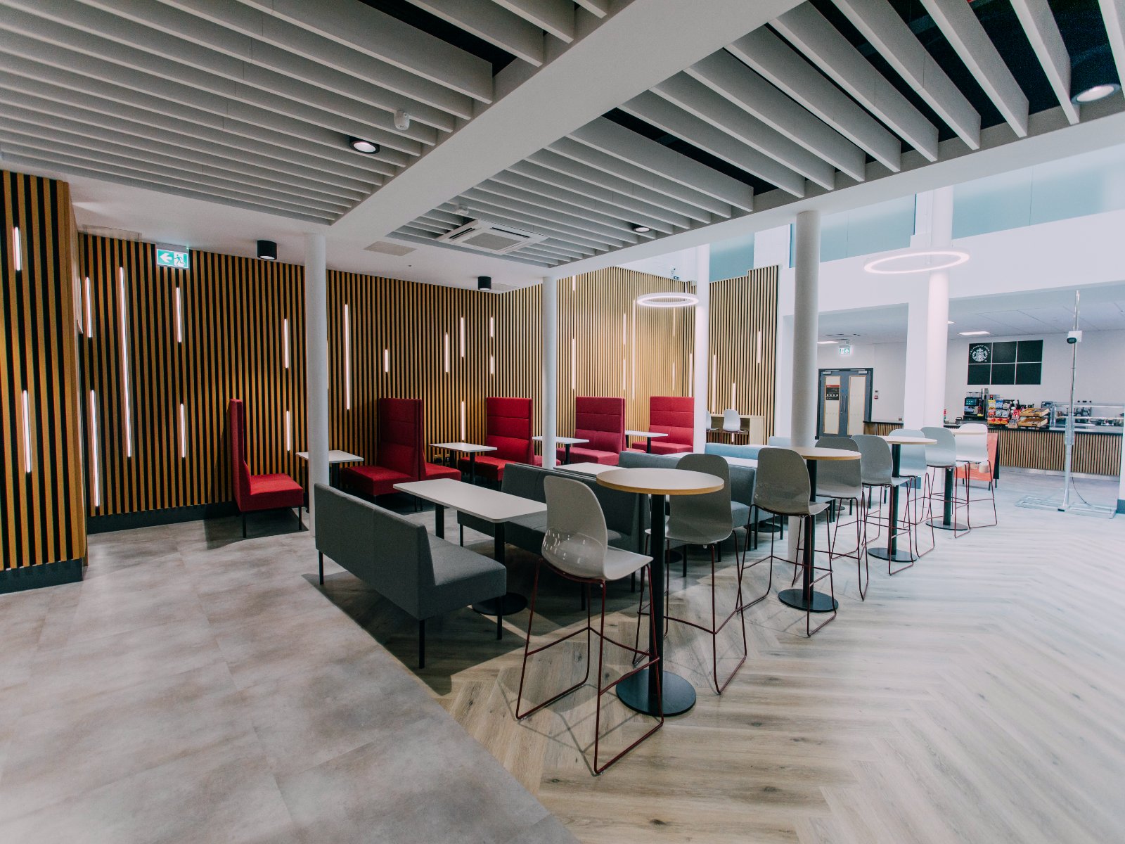 Our team played a key role in delivering high-performance learning environments through the expert installation of suspended ceilings and acoustic baffles, supplied by Ecophon. These modern, functional spaces are designed to enhance both aesthetics and acoustics—supporting students and staff alike.